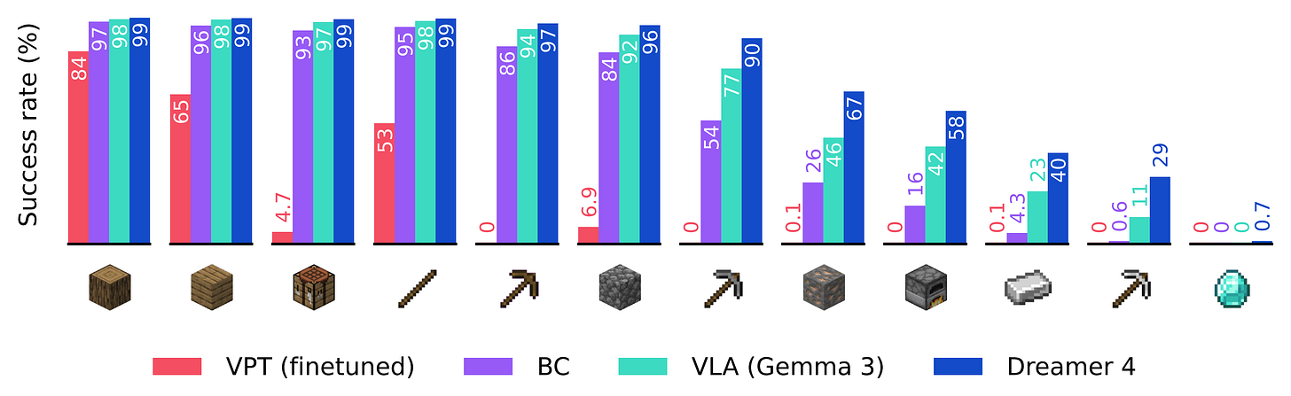 Dreamer 4 significantly outperforms OpenAI’s VPT offline agent, while using 100 times less data. It also outperforms modern behavioral cloning approaches based on finetuning general vision-language models.