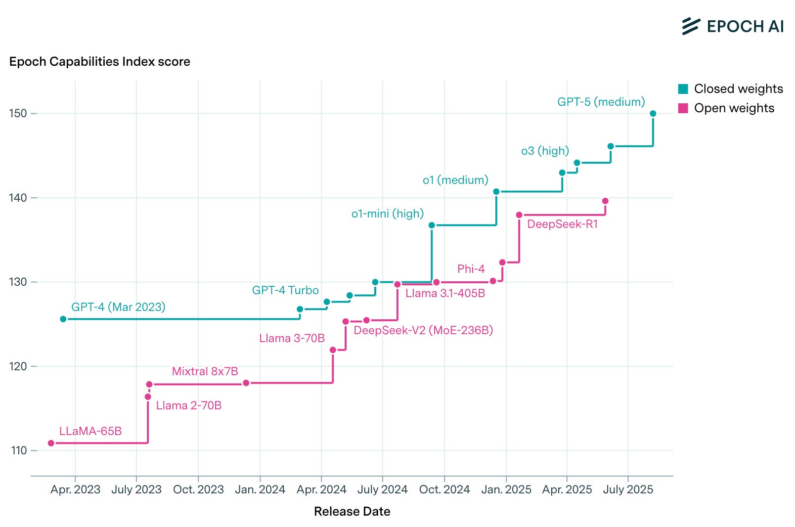 📈 Open-weight models lag analysis - Epoch.ai research showed open-weight models lag state-of-the-art by around 3 months on average, providing quantitative analysis of the gap between proprietary and open model performance.