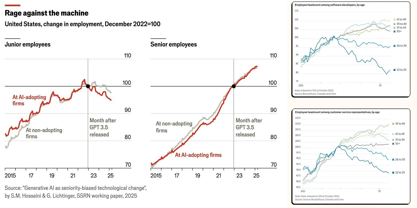📉 Junior SWE displacement analysis - Multiple graphs were shared showing a dramatic decline in junior developer hiring coinciding with the release of ChatGPT 3.5. The trend within the community appears to favor coding agents over junior hires for simpler projects. (👉 Anselme Trochu @ UN, Gawen Arab)