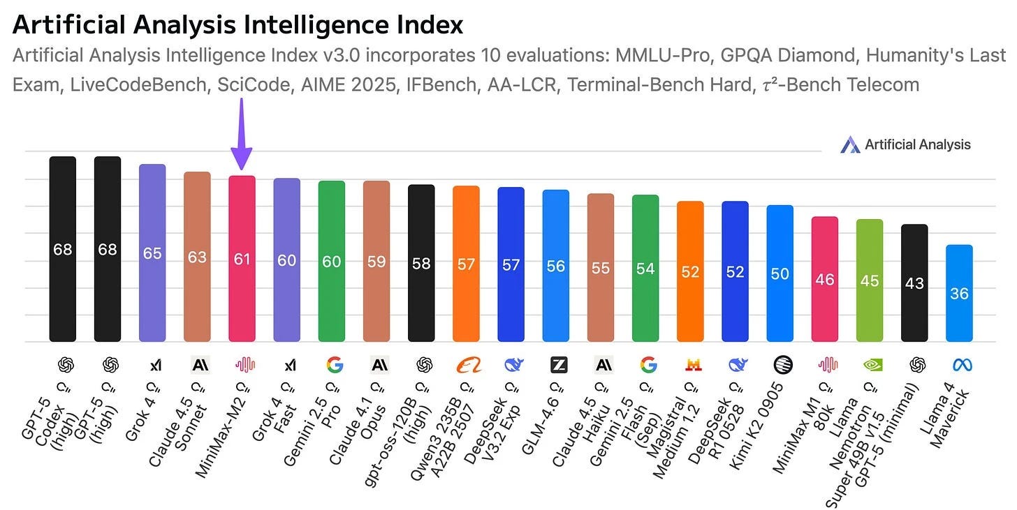 🧑💻 MiniMax M2 open-source release - MiniMax released M2 model claiming a new all-time-high Intelligence Index score for open weights models with impressive efficiency (10B active parameters, 200B total). Focused on agentic capabilities and coding, available globally free for limited time. Strong performance 2x faster than Claude Sonnet at 8% price. (👉 Kevin Kuipers, Julien Kilo)