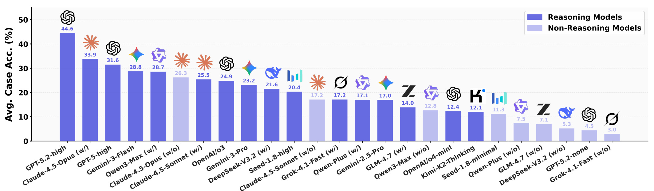 Models get decent constraint scores but low case accuracy, exposing fragility in end-to-end plans.