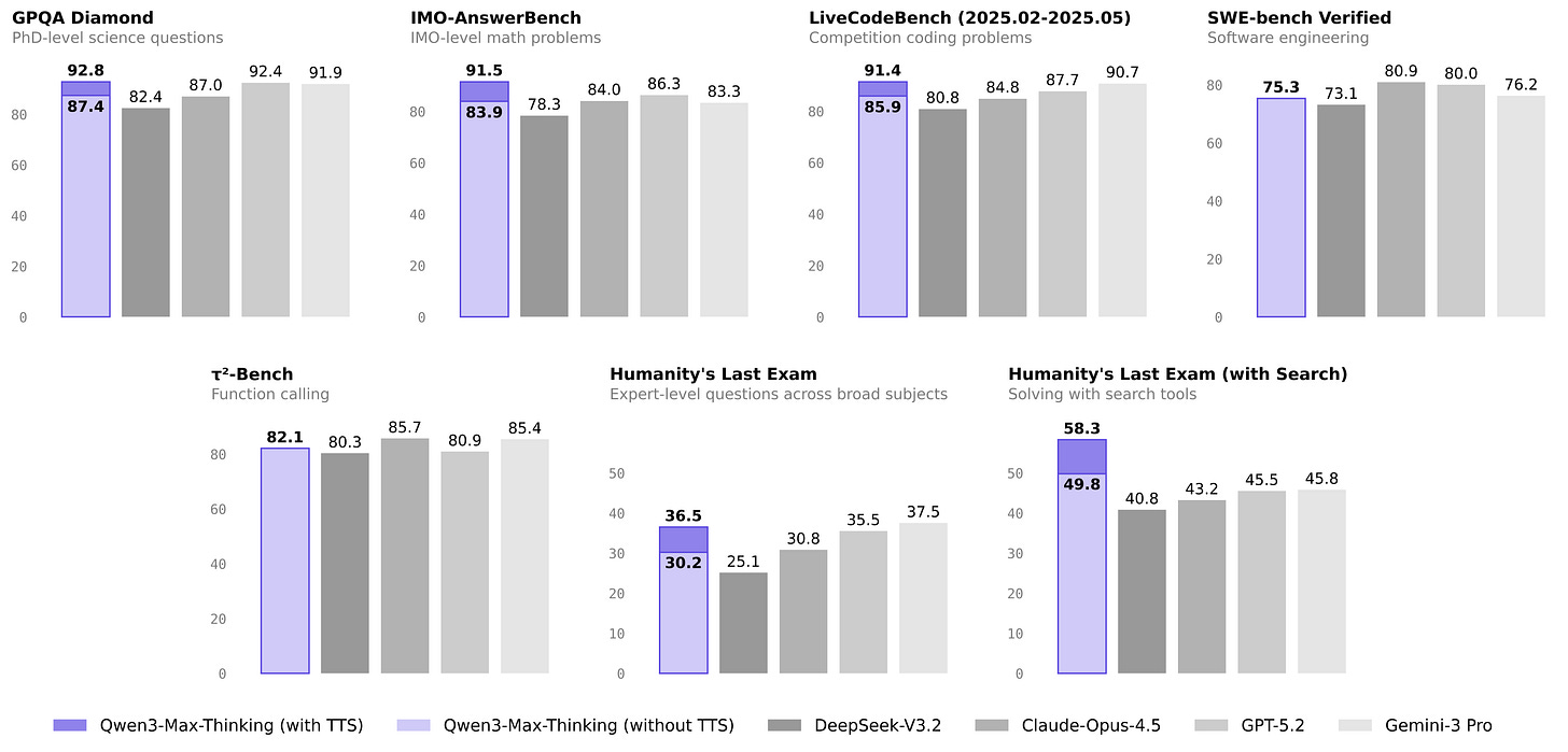🧠 Qwen3 Max Thinking model announced without open-source release - Qwen3-Max-Thinking is a scaled reasoning model with RL-tuned tool use and test-time scaling, matching frontier models on 19 benchmarks and exposed via OpenAI/Anthropic-compatible APIs. (🙏 Enrico Piovano @ Goji, Gabriel Olympie)