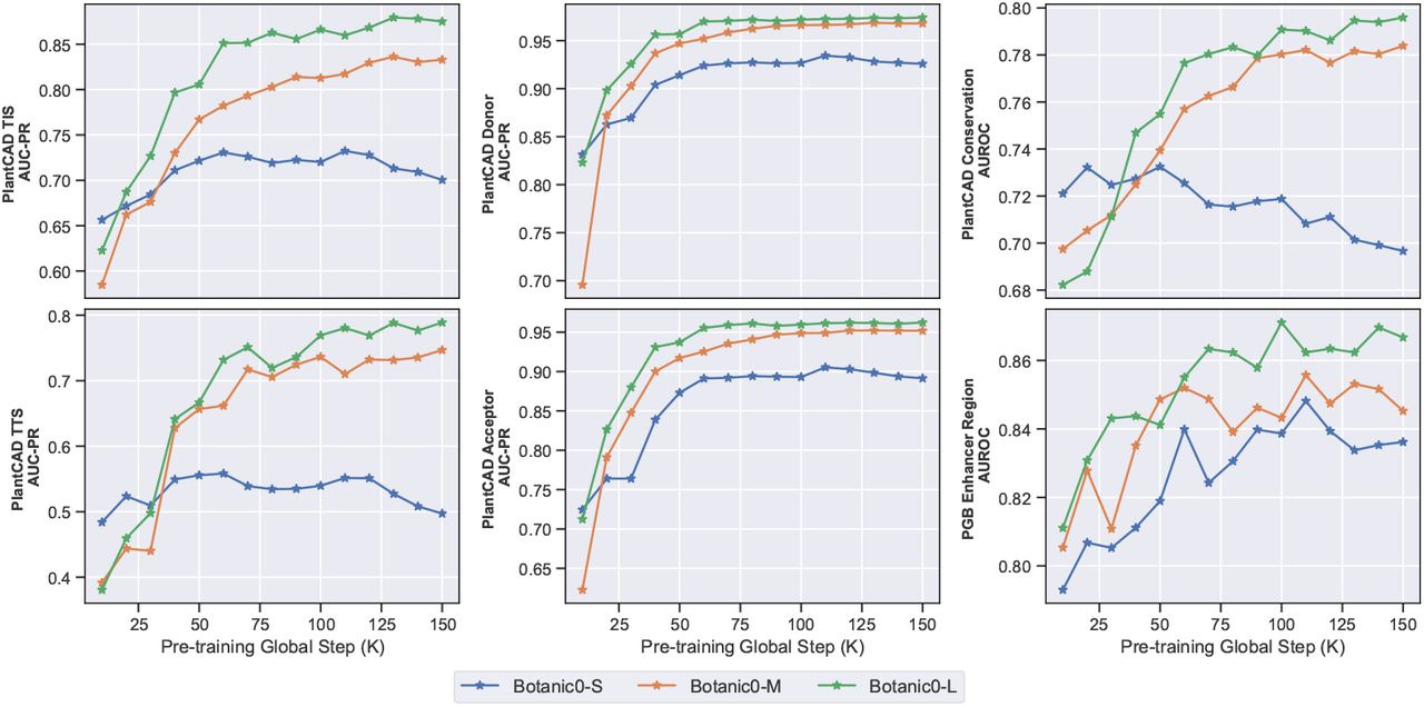 Three model sizes (100M–1B params) trained on DNA from 43 plant species.